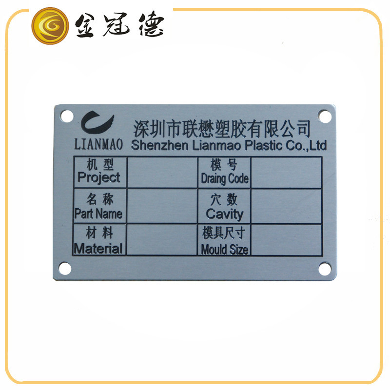 ⑴原料:厚度0.5毫米的不銹鋼板或厚度1毫米的鋁板。 ⑵色彩:黑底白字。 ⑶尺度大小:通常同制作廠家已裝置的銘牌。 ⑷裝置方位 :通常裝置在原銘牌周圍。 ⑸ 裝置時間:建檔后,裝...